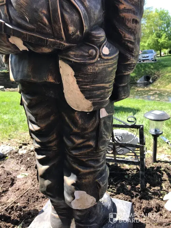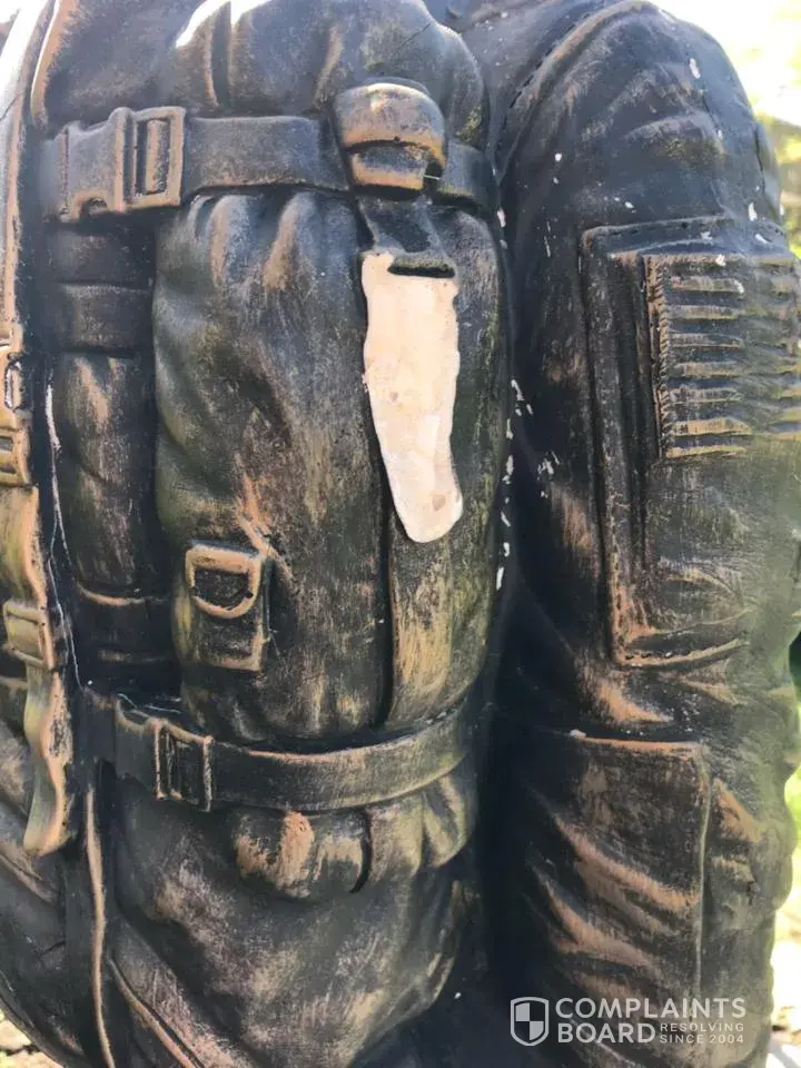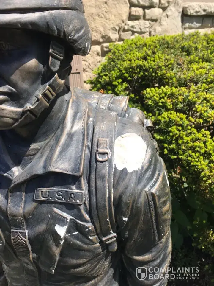 A year ago May my daughter purchased a soldier statue for me in rememberance of my sister Deborah D Jackson US NAVY. Large pieces of the statue are coming off. It started with flaking of his helmet around August of last year and has progressively gotten worse. I will attach photos.