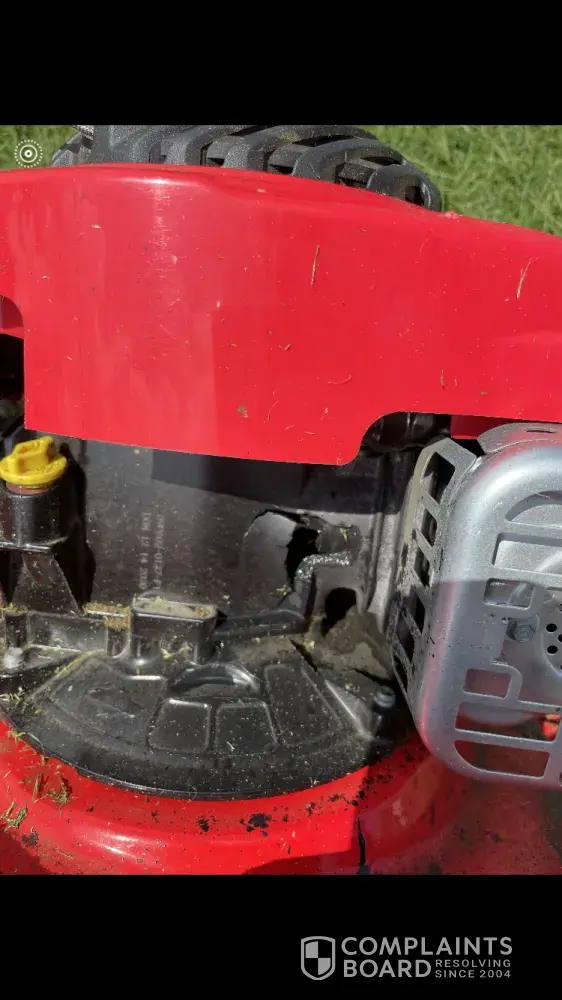 On August 21, 2021, I was cutting my yard with the above push mower when suddenly it started making a rattle noise and seconds later I seen metal shooting out of the side. Luckily my kids or wife was not outside and no vehicles or house was damaged. I picked up several pieces of metal out of my yard but believe there is more that I could not see. I purchased this lawn mower in April of this year and used 10 times or less. I am pretty disappointed with this product. See attached photos. The lawnmower will no longer start and makes a loud rattling noise when trying. This could have ended very badly