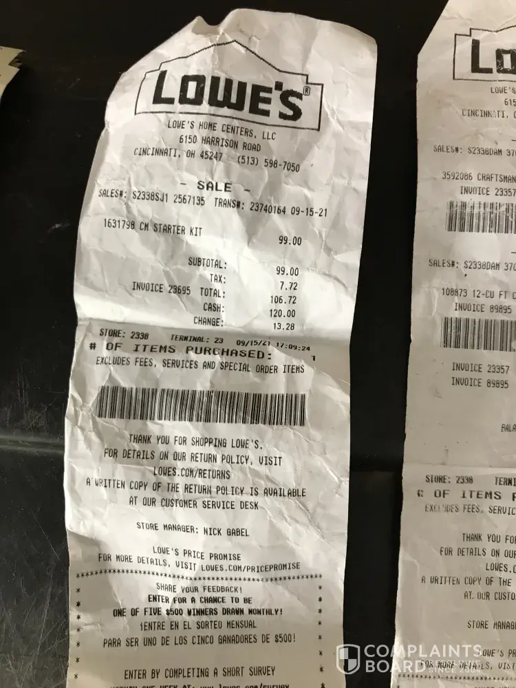 I bought a wheel barrel from lowes in Jacksonville N. C on [protected] and the bed of the barrel split. I sent a picture of the split on [protected] and was told someone would contact me. I received a email on [protected] someone asking me how was the service for my claim. When I told them no o e had contacted me NOTHING. What do I need to do. I've tried calling the customer service number for two days and it is constantly busy. Why say someone will contact you and then NOTHING.