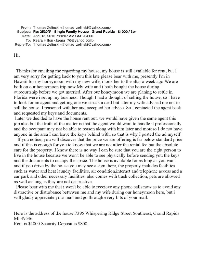 I replied to an ad on Craigslist about a house in Grand Rapids Mi that was being advertised as a rental and the asking price was $1000 per month. The house address was listed as 7395 Whispering Ridge Street in Grand Rapids, MI. The person who replied had the email of: [protected]@yahoo.com. After some research, I found that the house was NOT for rent but rather was a currently listed house for sale by Coldwell Banker agent, Brian Clinger, for an asking price of $250, 000. I contacted the selling agent who verified with the owner that he had not placed an ad on Craigslist for the house to be rented and that he was not out of the state of MI on his honeymoon, as the perpetrator had stated in his email to me. I was asked by the selling agent and the actual owner THOMAS ZELINSKI, to report the ad to Craigslist as well as the FBI, which I have done. Here is a copy of his email response to me: