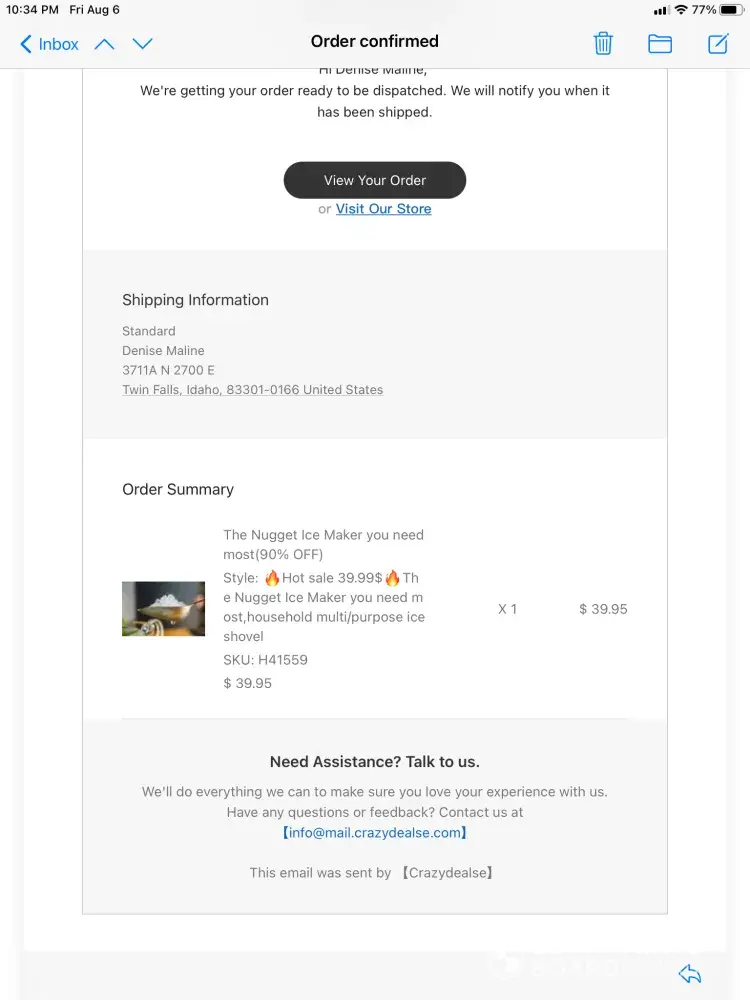 I ordered this nugget ice maker on July 7 for $39.95 from an ad on yahoo, after carefully reading the description, examining the photos posted on their website, etc. It looked a bit sketchy but since they took Paypal and I used a credit card with purchase protection, I decided to go for it and see if was actually legit. I should have googled reviews first! Well ... a few weeks later I received a cheap ice scoop. At first I couldn't figure out where it came from, as the return address did not list crazydealse or anything like it. Then my husband googled reviews for this company and came across MANY bad reviews for this exact same ice maker purchase; most customers received the cheap ice scoop. I emailed the company but also filed a claim with Paypal. Paypal refunded my purchase pretty quickly, and the next day I got a reply from the company asking me to please cancel my claim with Paypal (um, too late) and they would like to offer me $15.00 refund and were so sorry I was unhappy with my "purchase." *eye roll* Ridiculous. Total scam company - don't buy from them!