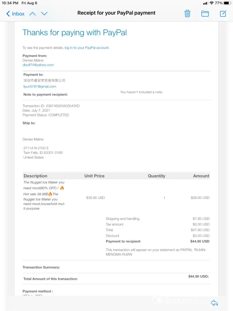 They lead you to believe you were buying a ice machine and sent you a ice scoop. $45 ice scoop. I ordered it July 4, 2021. The advertisement gave the description that you would be getting Nugget Ice Maker for 90% off. Email for the the vendor is [protected]@gmail.com. Transaction ID is 58957048kk7270918. Per email from paypal the transaction will appear on my statement as RUIANMENGMA RUI
