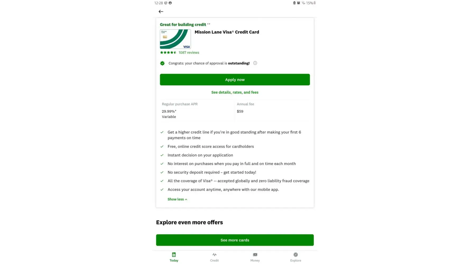 I got a notification on Sunday morning 4th of September, approx. 11:30 or so... when I was within the application while checking my score. It was from Mission Lane and said I had "Outstanding" odds to get approved. I applied and then Credit Karma sent me a message saying I was declined because of fraudulent activity from my IP address. I would have never applied for this card had I not gotten the notification while I was checking my score in the first place. I also wasn't able to find any more information on what the potential fraud from my IP address was in regards to. Just to be clear as well, there wasn't any type of fraudulent activity taking place. As a result it is now going to take me significantly longer to build my credit as I previously had great credit but just stopped using credit in preference to cash at the time. The fact that Credit Karma is supposed to be a "service" it seems as if they are complicit in deceptive practices as a gatekeeper to better credit.
