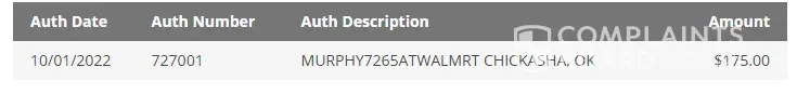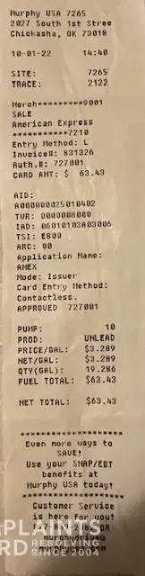10-01-2022 at 14:40, my husband went to Murphy USA [protected] South 1st St - Chickasha, OK 73018 to fill his truck up with gas. TOTAL PRICE was $63.43. He came home and I logged into Creditone.com to check the charges. Imagine my surprise to see $175.00 charged to our card.