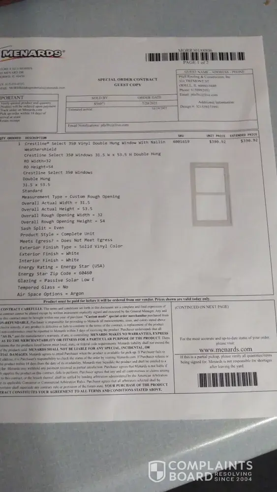 Maybe we should have waited to contact you first but we didn't. I purchased 4 350 crestline windows March 6, 2021, order confirmation # [protected] from Menard's, it took about 2 months to get. I understand this and I am not complaining on time line for delivery. We had a contractor put our windows (3) in our living room. The second window we could not get to fit our opening so it was level and plum, we left it and put 3rd window in. When finished we went back to second window and it wouldn't line up, locking was hard, we couldn't raise the window and it stay open, it just wasn't fitting. So we took our fourth window and first try of fitting it in there was good. So I was stuck with a window that wouldn't work right and didn't want to place in our other opening and not have it work right. So we took back to Menards and given a refund, I didn't want a refund, I wanted a window to replace the one that didn't work. They sent me back to order my window, we ordered the same as we ordered four, only difference instead of paying 313.69 each for four windows, I'm asked to pay 390.92 for the same window. I was irate. I feel that my window could have been ordered for the same price. I'm stuck with ordering the 390.92 window to replace it. I feel that they could have reordered at the 313.69 price. So I'm sitting here wondering what to do. so with the higher priced window or go with a cheaper window and not worry about the difference. I hope you can do something about this situation for me. It's hard to believe in 4 months the price can go up 77.00. I'll be waiting for your response before deciding what to do. The other three windows I am very happy with and know we made the right choice. I attached our first invoice and then the estimate from Menards.