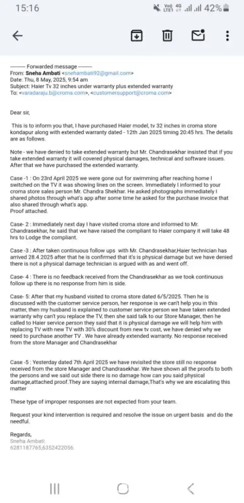 Dear Sir, With regards to inform you that,I have purchase 32" LED Haier brand TV 3 months before dated 12th Jan 2025, which is under warranty, and they have insisted to take extended warranty which they have explained physical damage, software and technical issues will be covered in this EW ,last month dated 23rd April 2025 i switch on the TV it wa...