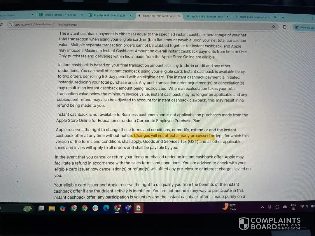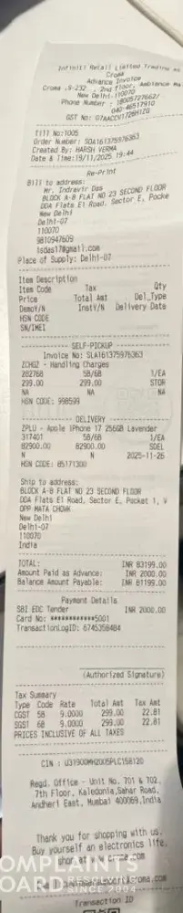 I booked the iPhone 17 through Croma's Vasant Kunj. New Delhi store (Ambience mall) on 19th Nov 2025 with a pre-booking amount of Rs.2,000 with the assurance that once the device arrives in-store, I will receive an instant cashback of Rs.6,000 through ICICI bank card. On 22nd November, Apple announced that they will be reducing the discount amount for...