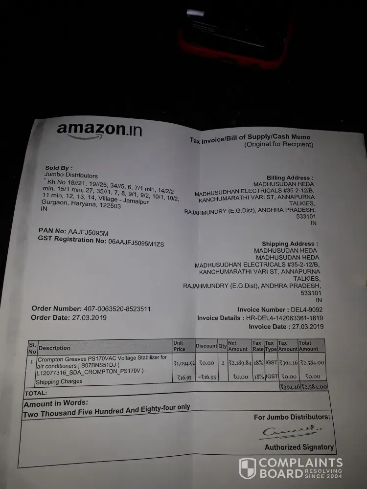Respected sir/madam, I am from rajahmundry (andhra pradesh) I have purchased 2 voltage stabilizers from amazon india on 27/03/2019 invoice no ; del4-9092, invoice details hr-del4-[protected]-1819. For ₹.2584/- on 11/05/2019 due to some manufacture defective I face problem in stabilizer ad I got 3 years warrenty online I gone service center on 13/5/19