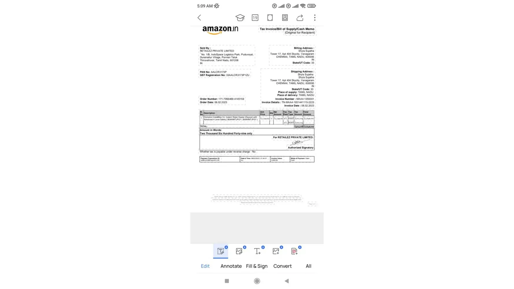 Bought on 6th feb 2023.warranty 2 years. there is leakage from 11th September.Gave service request twice request no [protected]/01 and [protected]/01 but they cancelled after 1 day. Please replace the water heater Or refund the money. Can i know the reason for cancelling my request. I have attached the invoice. Warranty, and photo of of heater where it leaks.
