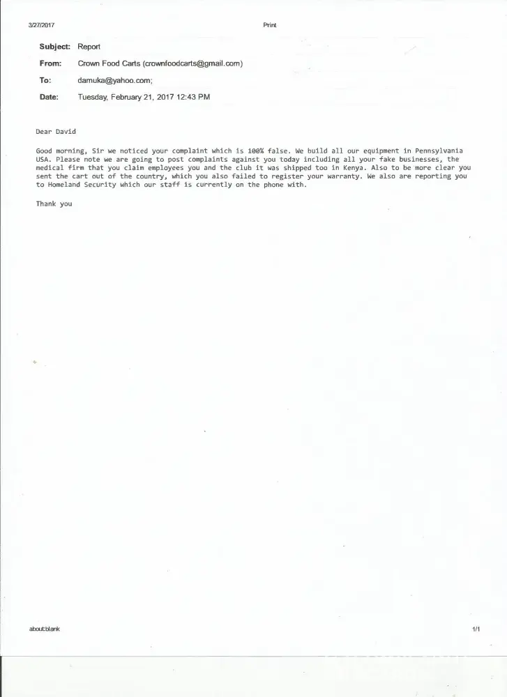 The owner has been arrested on Fraud. Please contact the Monroe County Police Dept in Penn and also look on the BBB site Crownfoodcarts and see the arrest information of the owner. Let them know you have been a victim of Crown food carts.
