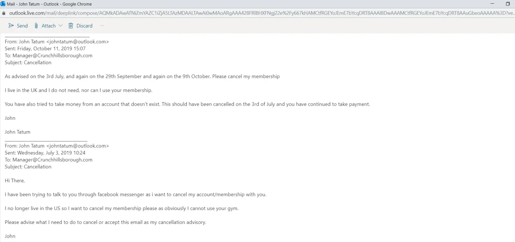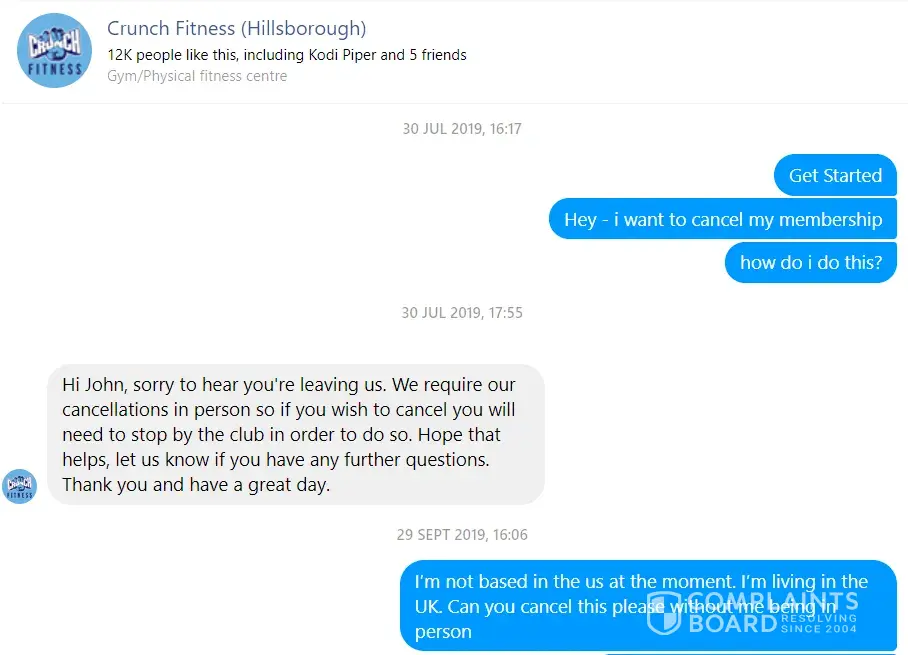 Hi. I would like an email address to complain to someone at your corporate location. I moved from the us to the UK in July. I contacted crunch fitness to cancel my membership. And was told that I could email the location to cancel I confirmed that I could do this via Facebook messenger I then emailed again to cancel and didn't get a reply. Crunch...