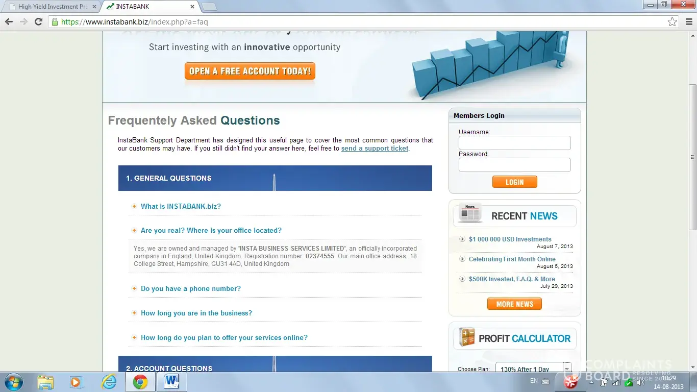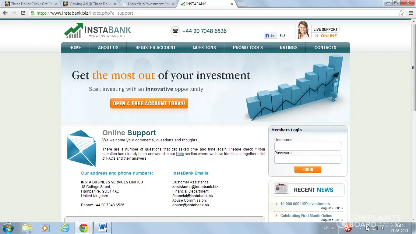 Dear Sir, I wish to complain regarding online fraud which happened to me. I had Invested an amount of $98.82 with www.Instabank.biz on 14/08/2013 in a scheme for 600% return after 7 days. After 7 days they credited the amount of $134.89 to my instabiz account. When I asked for $50 withdrawal ON 2108/2013, then they did not pay me the amount into my...