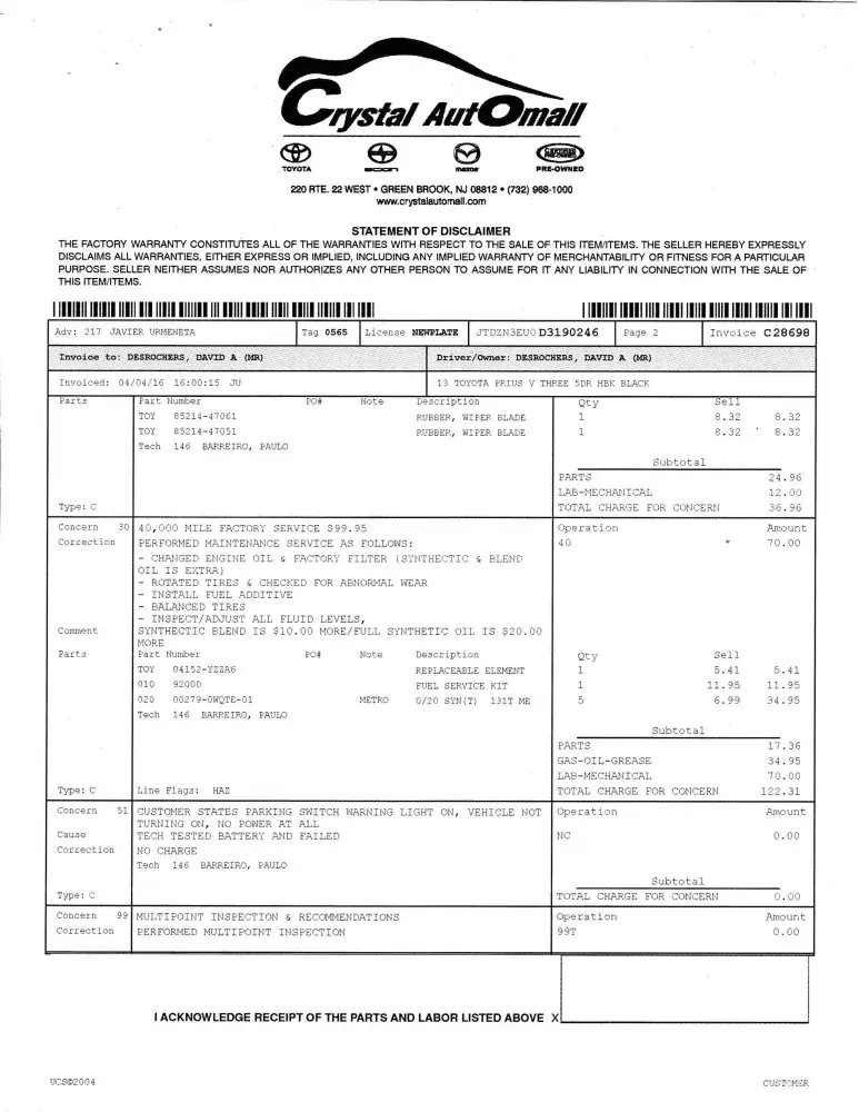 I found another Toyota dealer to service my Prius and recently purchased a new Subaru Forester. Go to Crystal Auto Mall at your own risk.