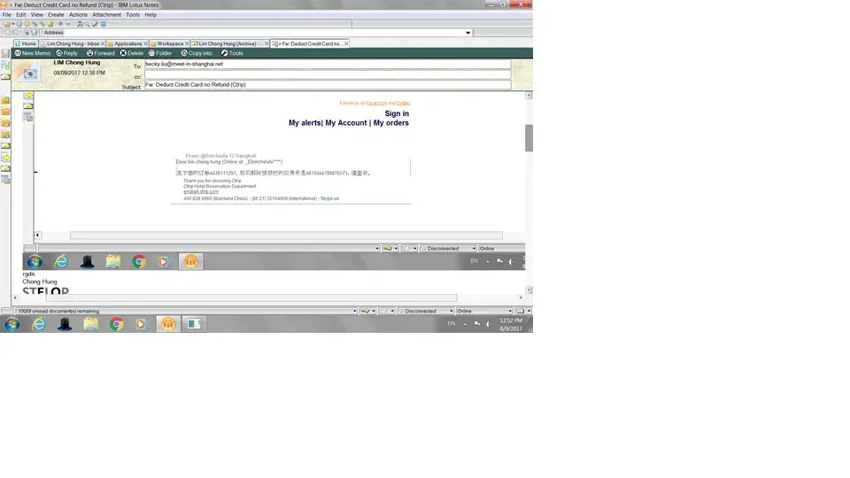 Flight was scheduled and confirmed for August 7th (tonight) at 22:15. To our surprise when we entered the Ctrip website last night (August 6th) to choose our seats for the flight we realized the date stated for the above mentioned trip did not match the booking confirmation sent via text message. Instead it showed our flight on August 7th was scheduled for August 6th, which clearly meant we had "missed our flight".
