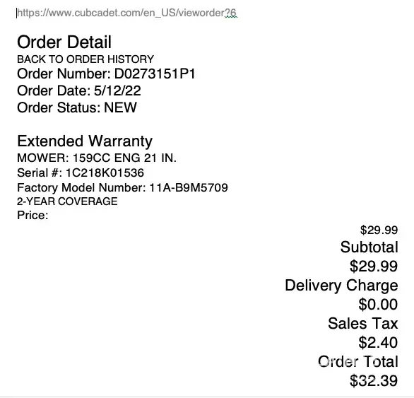 I made an online purchase of an "Extended Warranty" for this mower on 5/12/2022 for $32.39, icl. tax.