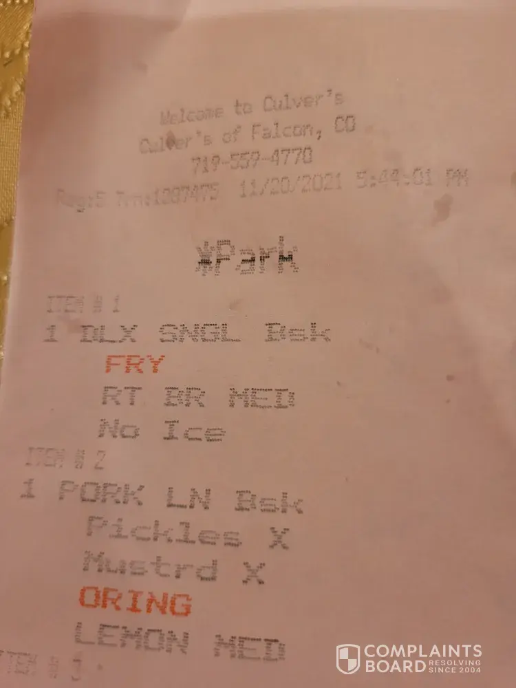We went to Culver's restaurant at 6:38pm we watched everyone get there food and leave 25 minutes later we got someone and ask them where I food was they said pull around front and 10 min brought us a bag of food after waiting so long we never checked our back our chicken sandwich was missing our French fries were missing and our Pretzel bites the only thing we got was butter double burger and sourdough Double Burger We called the store (771 and talked with manager Nick only thing he could say was they were busy not that he would get our food we want our money back for items not given to us the total was 26.14 and since we only have bag ticket we don't know price of items thanks to your incompetence one of our family members had to find something to eat this is not the first time this has happened but will be the last time you leave out food make us wait long times for food it was so much better in Wisconsin when we were on vacation we do not have money to throw away this should never happen and you need to train your manager what not to do you should take a close look at this restaurant (reg :5 trn: 418774 guest [protected]