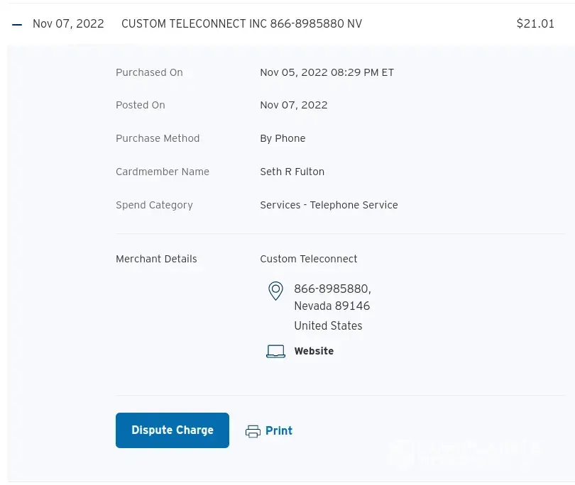 Avoid these people at all costs. The recording said .65 cents for the first minute (I had to listen to it 4 times to understand it) and .40 cents a minute there after. The call was 5 minutes. Then a charge for 28.00 showed up and a second one for 30.00. Then, they deleted once charge and added yet a third. I had anticipated fraud and had used a card that I first set at a balance of 24.00. Somehow they got the number of another card of mine and eventually dropped the charge for 30.00 and just pushed through the charge for 28.00. Its a VISA debit card and I'm calling them to dispute the charge. Most card companies side with the consumer most of the time. And, so I'm expecting the charge to be reversed. Go to Google and type in Custom Telecom Inc. Las Vegas complaints and you'll find lots of people reporting this kind of thing. The card companies need to ban charges from them. They seem to use 2 names, the second one being Custom Teleconnet Inc. Las Vegas. So, run that name in Google with the word complaints too. Usually, a merchant processor will drop a company with a bunch of "charge backs". So, keep up the complaints to your card company. These people are a menace to the community.