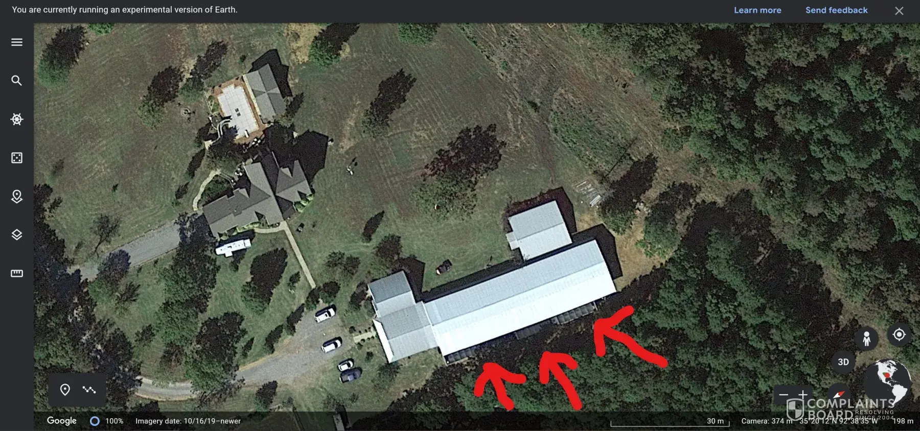 For clarification the area she is pointing to with the red arrows are not cages. This photo was taken high in the sky so the fact that you can even see them in the photo should attest to the fact that they are very large and are not cages. Also this lady has never been to my home so she has no idea what she is actually looking at. She does not even know what the building she is pointing to is actually used for. We have a farm with horses and cattle and chickens. We have large equipment such as tractors and implements. Just like any working farm we have to have a lot of outbuilding. For goodness sake she is using google maps and painting her on story. That one little area! That is very funny. Maybe she needs to keep looking on Google maps and she might find the rest of my areas...Lord only knows where her imagination will take her if she does. A honey bee does not waste her time telling a fly that honey taste better than crap...My pups do not get shipped off. You are more than welcome to pick up your puppy. My daughter can bring your puppy to you and I have a list of cities on my website that she can drive to and meet you or you can arrange for the flight nanny to fly with your puppy in cabin. This lady is just not someone I want to have one of my pups. She got a refund of her deposit and she is upset.