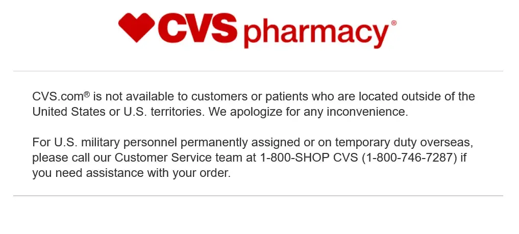 CVS Pharmacy is currently blocking Americans from viewing and purchasing from their website while outside of the US. Many Americans travel abroad on a regular basis for vacation, work or to live in other countries. Many of them need to be able to make purchases at CVS and ship those purchases to their US addresses. I personally know people who would order products such as medication, personal care items and other things and have them shipped to their elderly parents back in the US while traveling abroad.