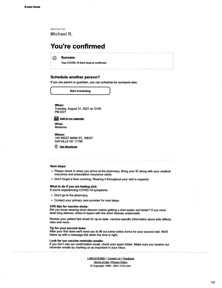 I filed an online application for a booster shot with the West Sayville, NY CVS store and received a conformation for August 31, 2021 at 12:00 PM. As I am 81 years old I had some trouble filling our the form, and getting to the store would not be easy for me, I called as well to check on the confirmation. Was told all is fine, I was confirmed and should...