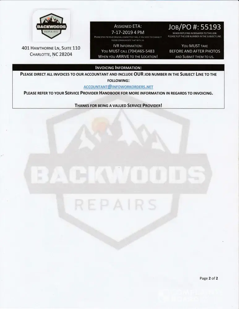 I received a call today from someone with a Florida number. She said their company name was Backwoods Repairs. Then asked if I could take care of a service call at a nearby Walgreen's. She mention it usually took up to 60 days to get paid. But because I was a new vendor and responding so quickly they could make it 30-45 days. Something wasn't sitting right...