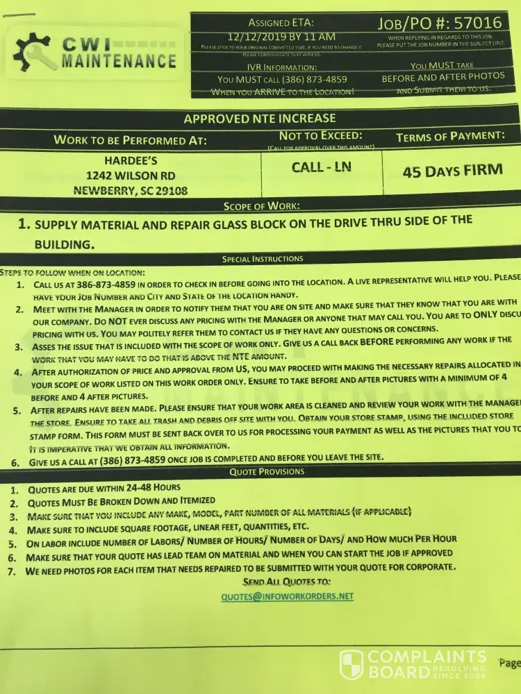 On December 10 I was contacted by CWI to do a repair at the Hardees in Newberry South Carolina the repair was done and invoicing was sent in actually called to let them know that it was sitting there make sure it was there on a recorded line and was told by Miss Melissa yup it is here now miraculously Miss Melissa doesn't know who we are Miss Kendria who is the dispatcher please dispatcher when it gets hot in the kitchen but on December 10 she was calling me on a recorded line asking if I was going to be able to do the repairs and get to them In a timely manner now I have tried to correspond with them and miraculously they do not know who I am now they are not answering the phone and we still have not received payment we are filing suit and we are actually actually planning a trip to Florida to be met by other contractors that were not paid and employees that were not played either we plan to pick it and I have sent every corporate office and will continue to do so faxes every week until CWI is stopped and just so you know they change their name and open up another company.