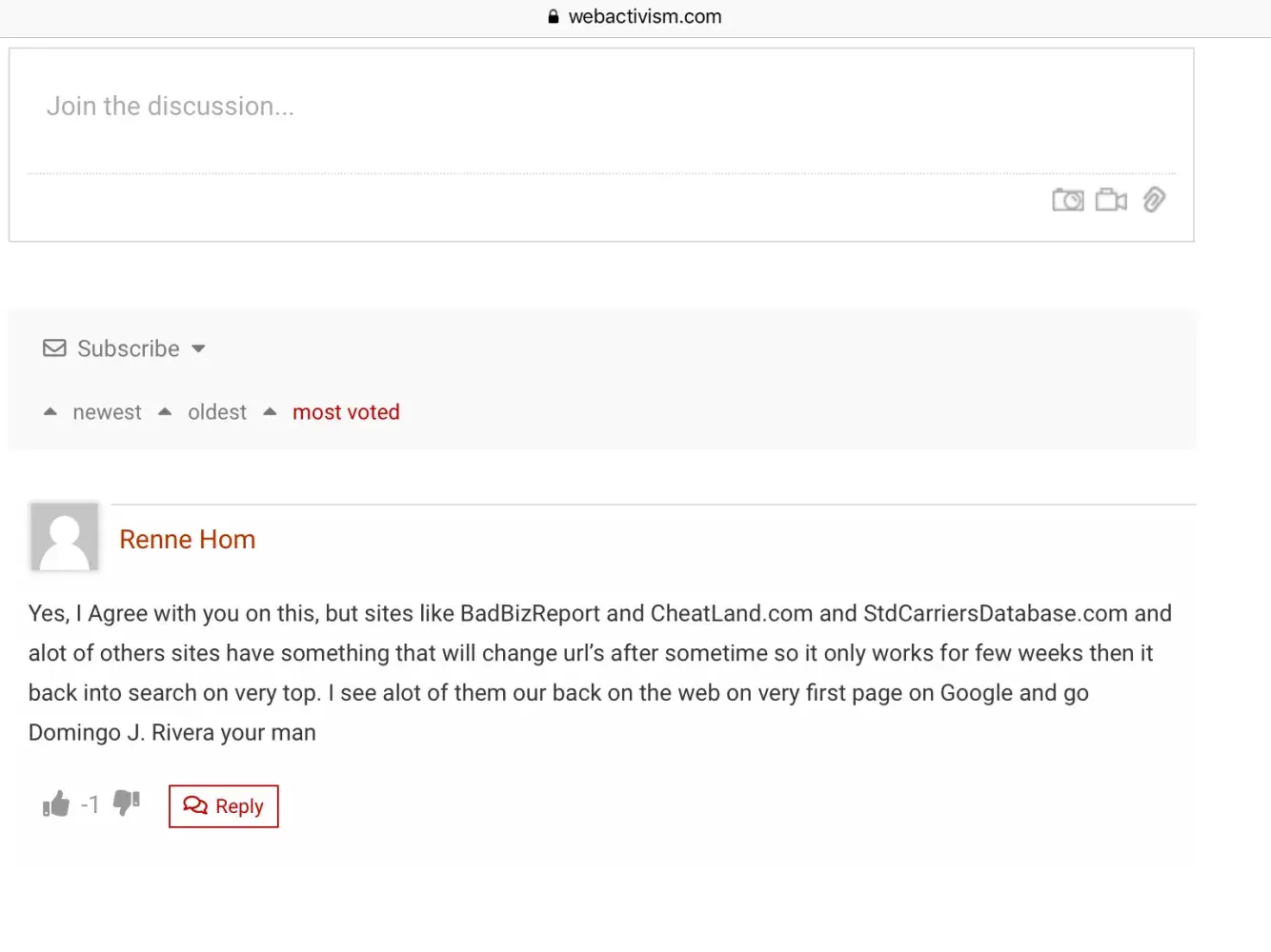 Here’s an example of someone using my name to comment on a WebActivism post in order to wrongly draw attention to me. Such person must harbor great animosity to get me targeted. Perhaps Scott Breitenstein or his son, who owns cyberextortioner.com, had done this to falsely paint me as an extortionist by tying me with this Rivera guy (whom I don’t know). When I write, I don’t have such horrendous grammar, spelling and punctuation mistakes. So, that clearly wasn’t me.