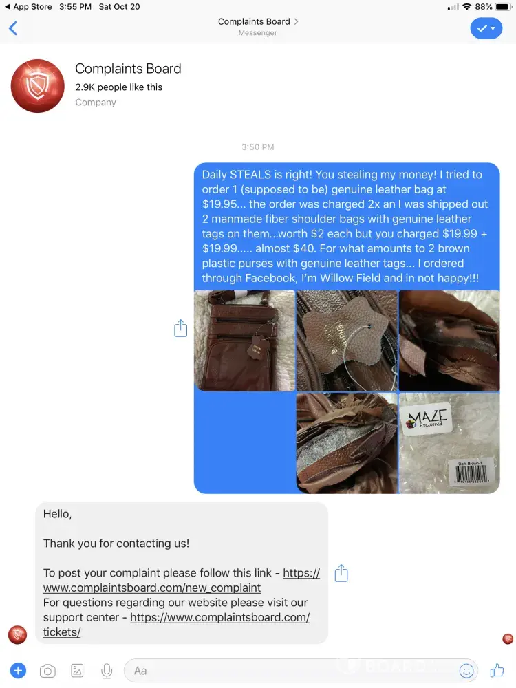 Daily STEALS is right! You stealing my money! I tried to order 1 (supposed to be) genuine leather bag at $19.95... the order was charged 2x an I was shipped out 2 manmade fiber shoulder bags with genuine leather tags on them...worth $2 each but you charged $19.99 + $19.99... almost $40. For what amounts to 2 brown plastic purses with genuine leather tags... I ordered through Facebook, I'm Willow Field and in not happy!