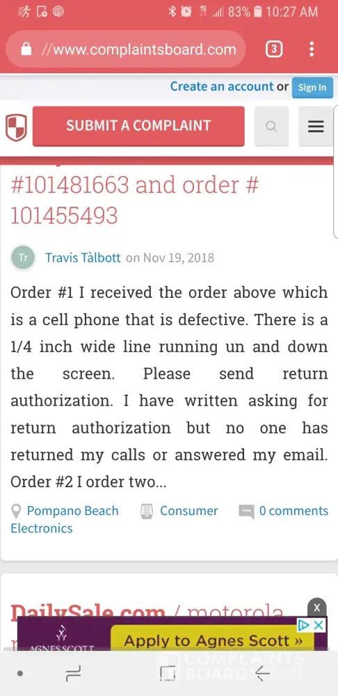 I ordered a cell phone from dailysale.com. waited 3 weeks for delivery, they said that I was going to receive the tracking information but I never received it. And when I turn on the cell phone it has a big pink line on the screen. I tried emailing them, calling them and no one answered. I want my money back. I spend 148.00 These are complete scammers!