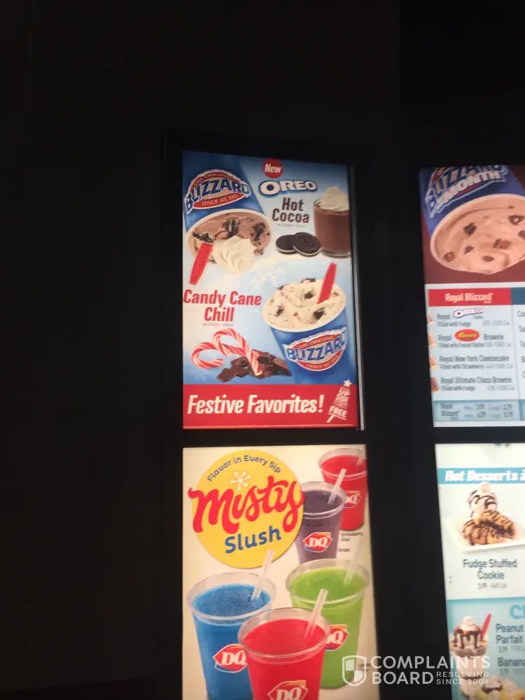 1/10/18 we went to DQ in Tipp City, Oh. Candy cane blizzard was still posted. I asked for it. The manager stated they didn't have it. We informed him it was still on the drive thru board. He said bull! I took it down myself. He was very rude and disrespectful. The other young man working was apologetic. The manager went and saw it was up but refused any discount to be given no apology