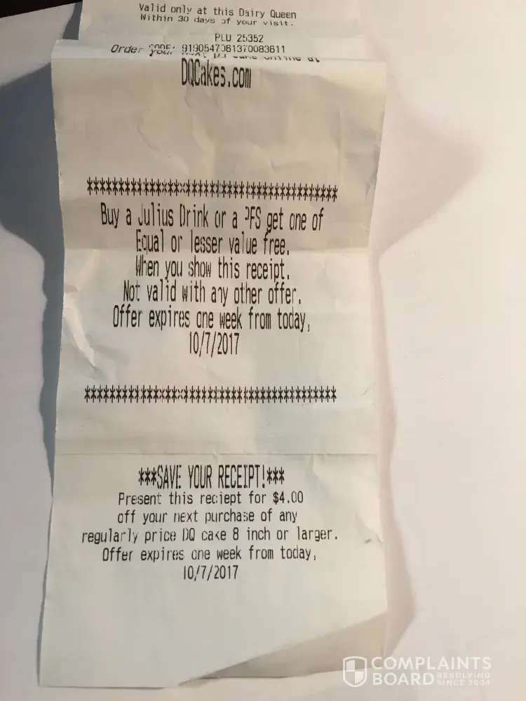 Hello I went to Dairy Queen Hubbard Ohio 44425 yesterday October 11 to get a cake for my daughters Birthday. When I got there, I picked out a cake, it was light green and light blue and stood at the window for five mins before anyone would wait on me. They had no other customers at the time. I gave the girl the cake and told her what I wanted wrote on it.in the mean time another girl came up to ring me out. I had a DQ coupon for $4.00 dollars off any 8" cake or larger. She told me I could not use it. This coupon was from a dairy Queen receipt that I had from October 7th and it says use within a week. She said it's not theirs they won't use it. No where on the receipt does it show that. The receipt is from DQ store# 13580. I let that go and paid for the cake. The girl brought the cake out and it looked like a 4 year wrote on the cake with big black letters so big it was going over the edges of the cake. I was embarrassed to even take to my daughter but I did because I had no other choose.