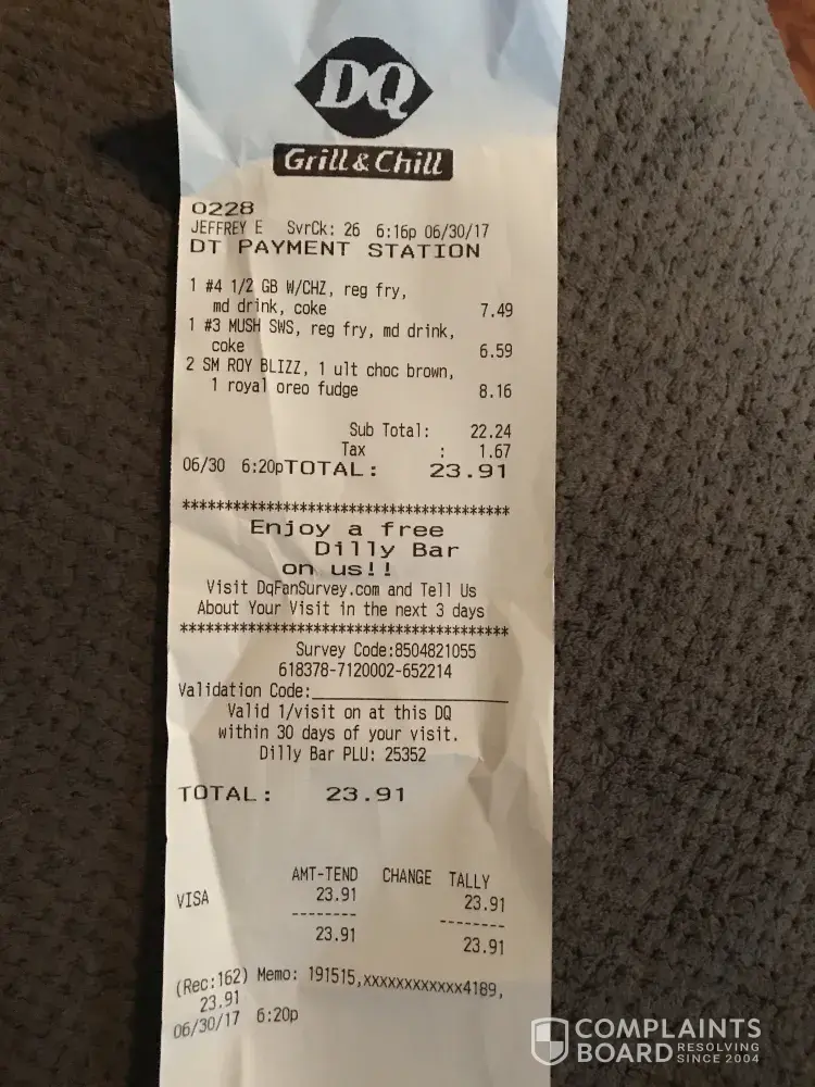 Dairy Queen the quality of the blizzards we ordered and the customer service