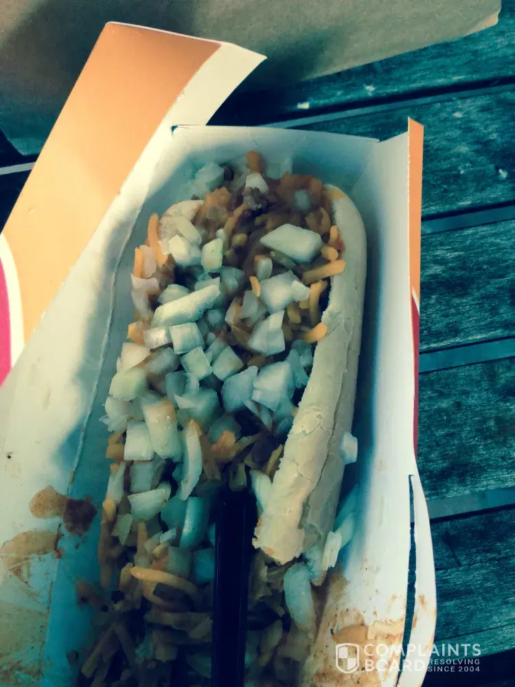 I ordered three chili hot dogs from Dairy Queen Restaurant. They sent me dogs with tainted sausages. I came there the next day and took sausages with me. I wanted to show these sausages to the customers because to my opinion it is terrible! They sent me this food because they thought I will not come.