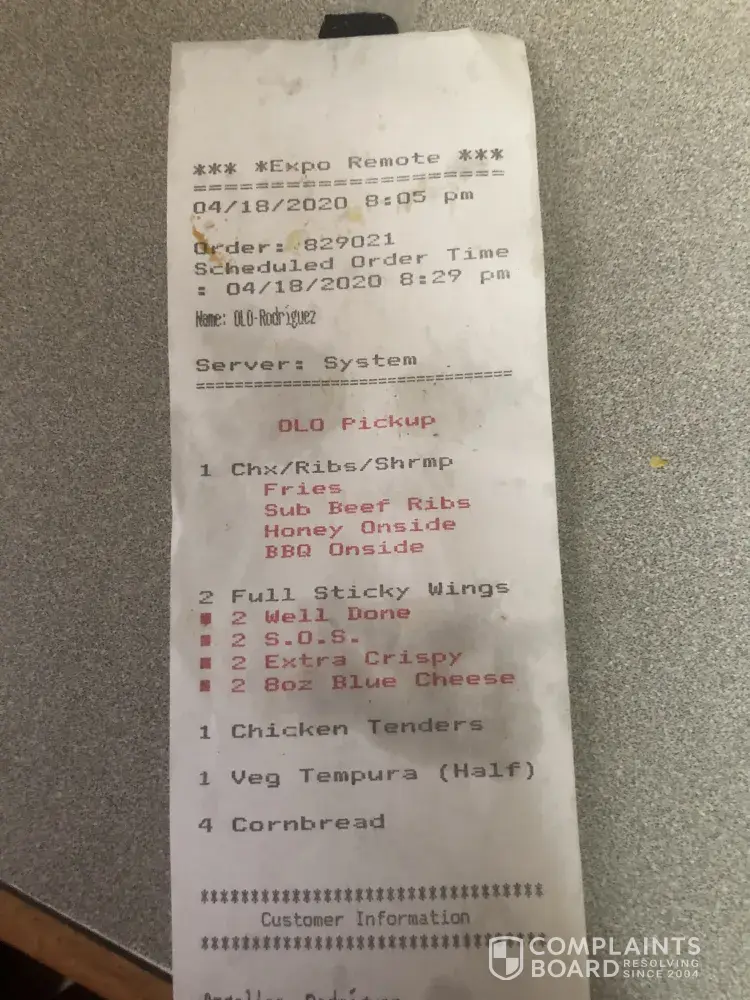 My order was a complete disaster. First the sticky wings I ordered did not have the honey on the side. The chicken wings were naked with no breading so they were not even close to being crispy let alone edible. The corn bread that I paid for was as thin as a cookie. The drink I ordered was watered down because they put it on top of the chicken wings in the bag. They were completely backed up and extremely rude. The phone was busy so I couldn't call to get my refund, I have sent multiple notes online but no response. I would like a refund for my order #624099