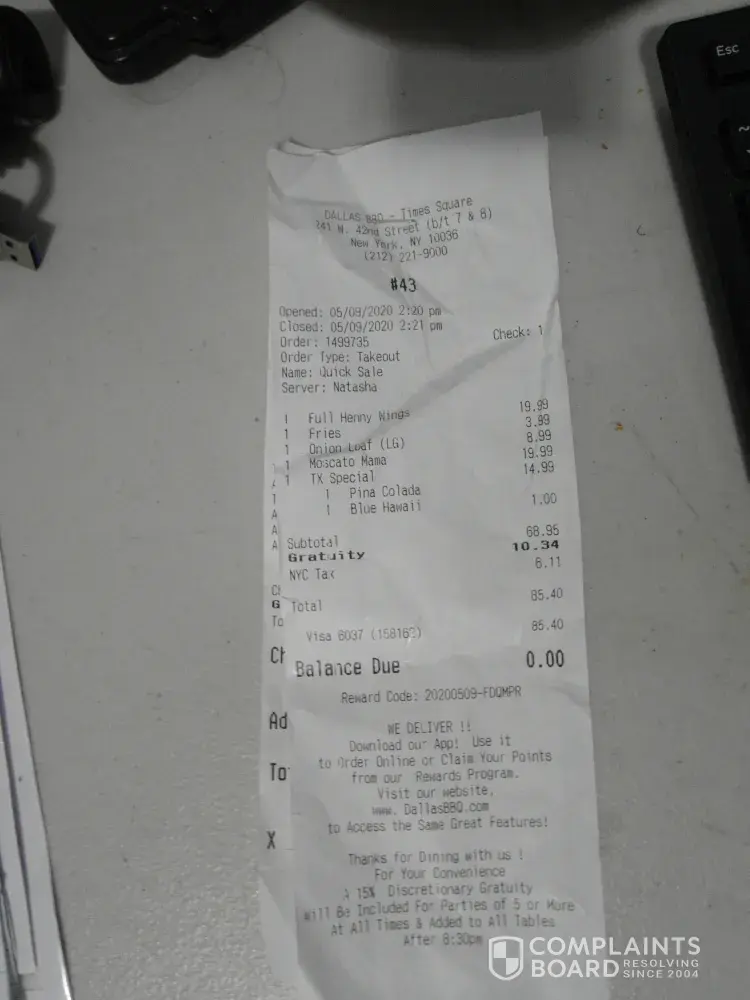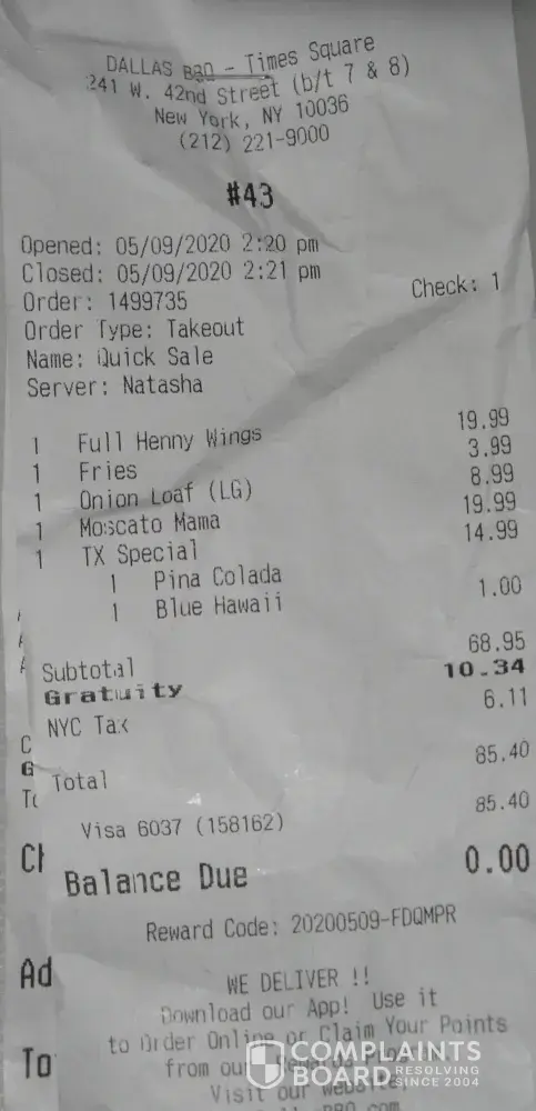on May 05, 2020 at 2:20pm I was at the 241 W. 42nd Street Dallas BBQ - Times Square I ordered: 1 Full Henny Wings 1 Fries 1 Onion Loaf 1 Moscato Mama 1 Blue Hawaii Totaling: $75.06 with tax I paid with my Visa ending in 6037 After getting on the train I realized I was charged an additional gratuity charge of $10.34, This gratuity was given without my...