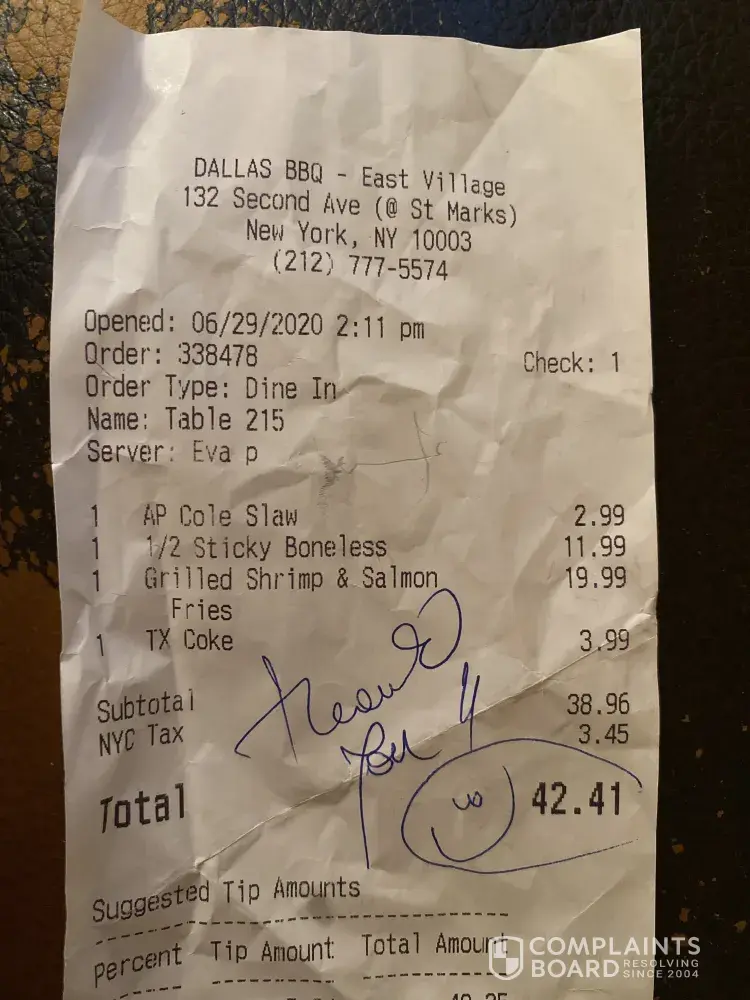 On 6/29/2020 my husband and I met up for lunch at dallas bbq location east village, 132 second ave, we sat outside.. After waiting 45 minutes and no food I complained.. The whole time I sat waiting for my food I watched a large amount of takeout orders being prepared for pick up.. After waiting another 30 minutes and two more complaints and 3 excuses later...
