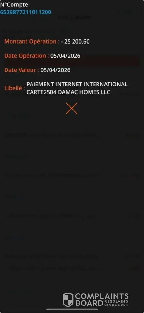 Hello, I would like to inform you that I am a victim of a fraud involving my bank card related to a transaction under DAMAC Homes LLC Dubai AE. On 05/04/2026, an amount of 9,551 AED (25,200.60 MAD) was charged and has already been fully debited from my account without my knowledge or authorization. For your verification: Account Number...