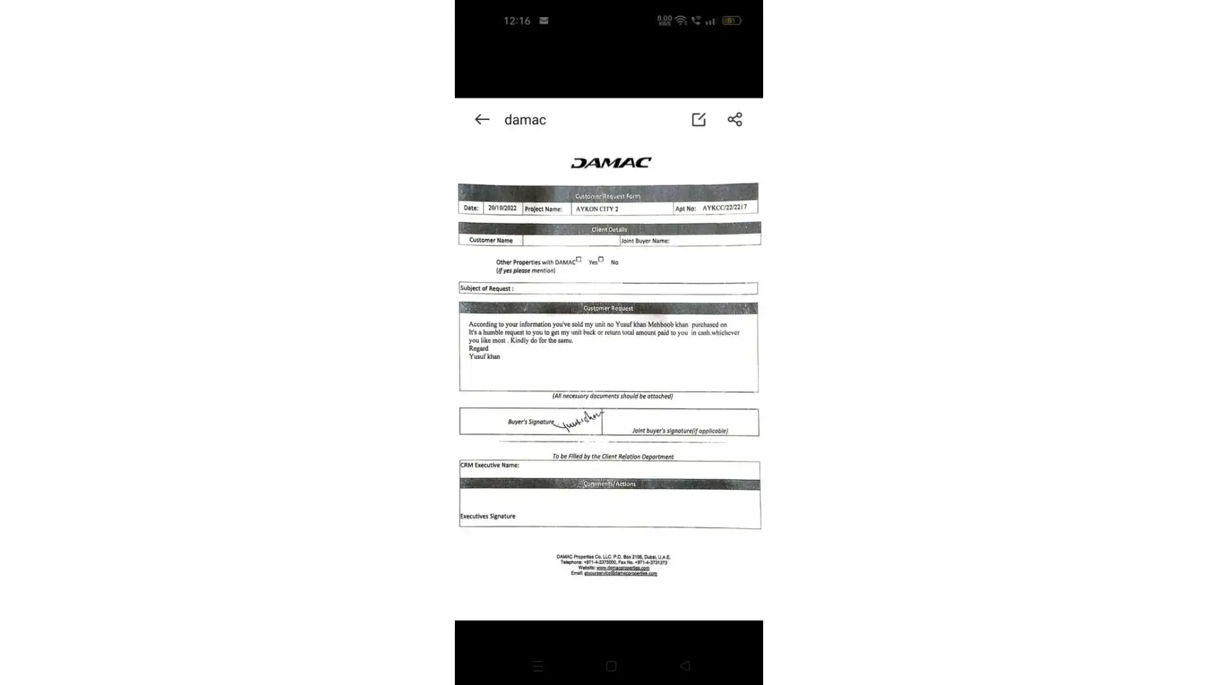 I urge you to take immediate action to address this issue and provide me with the support and assistance I require. I expect better service from a company like DAMAC, and I am deeply disappointed by the lack of professionalism and responsiveness exhibited by your CRM team.