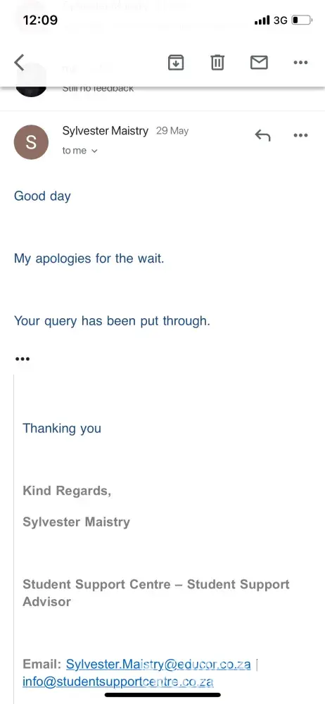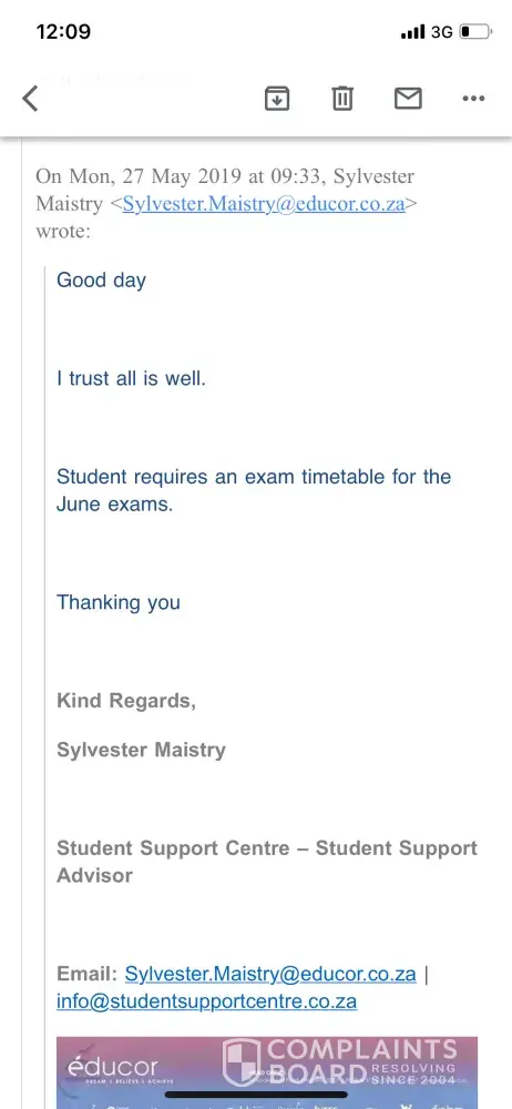 I am due to write an External exam next week Tuesday 28 May. I submitted my exam entry form with proof of payment on the 10th of April as this was the last day to submit the form. I have been phoning since last week Friday 17 May to get a confirmation of my exam as I am travelling from Grahamstown to Port Elizabeth to write. I spoke to Sibusiso on Friday 10 May who told me that he has over 600 confirmation letters and he has to physically go through them and he will contact me. I spoke to Warren on 14 May who told me to forward the email I sent on the 10th of April with my form to register to him and he will follow up with the relevant department. I reminded Warren Dhelmini again on the 15th of May with an email. I sent another emai to dccbranchr@icg.edu.za on the 16th of May and a Luche Stevens responded on the 17th of May saying that I was asked to send the exam entry form. I forwarded my exam entry form to Luche agin on the 17th of May. Today (22 May) I spoke to Sibusiso Sikhundla again asking me to forward my exam form to him and to remind him aging tomorrow (23 May ) again so he can follow up with the exam department. The Cherry on the cake is that i am writing on the 28th of May!
