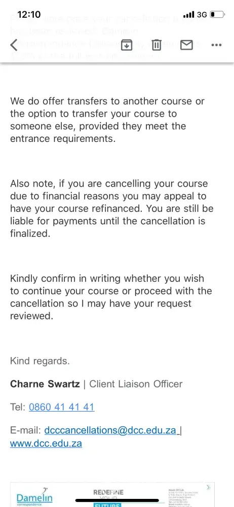 I am having a really bad experience with Damelin Correspondence College. When I wanted to register there was no problem with getting assistance until payment was made. thereafter nothing. I have not yet received my assignment results and they where to be out on the 6 of May. for all 3 exams there were not enough exam papers for all the students. For the next semester I wanted to purchase my book- guess what? the book is out of print. I emailed Damelin and still no new ISBN number. the only answer I get is - we have forwarded your query to whatever department for urgent assistance and still no answer! Today I went to my student portal and find out that I received in my 2018 academic year 28 points for economics. Aren't we in 2019? How do I know that these are my results? Emailing - Calling - chat site - student portal - nothing works! for the amount that I paid for this course the service should be excellent! Any suggestions?