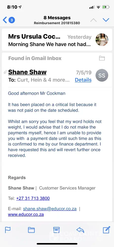 I was told to fill in reimbursement forms. It took 2 weeks before they could notify that they received all forms. I was told to wait 6-8 weeks for payment . After 8 weeks I contacted them saying I did not receive my payment. They gave me a date for 2 months later 28 June 2019, saying its scheduled for payment then. On 28 June no payment was received. Upon calling head office they gave the run around and always say someone will call you back . We were first given the run around where they kept referring us to different head offices in Durban and Cape Town . Shane Shaw was supposed to call but only emailed back when my lawyer emailed them. For over 2 weeks now him and Zinhle said we are on the critical list but does not respond to further queries and have not given us an update on anything