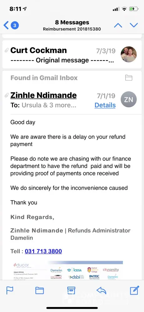 I have being studying with Damelin Durban for 3 years now with a lot of issues, I decided to go directly with the agent, however I had about R2000 as an over payment in my Damelin account, i requested a refund in January but never got a response from the accounts persons at damelin up until July, now they tell me i have to wait 3 months for the refund to be paid out, how ridiculous that ? I cant understand why does a student have to wait 3 month for a refund to be processed, when the college is at fault by producing pathetic service.