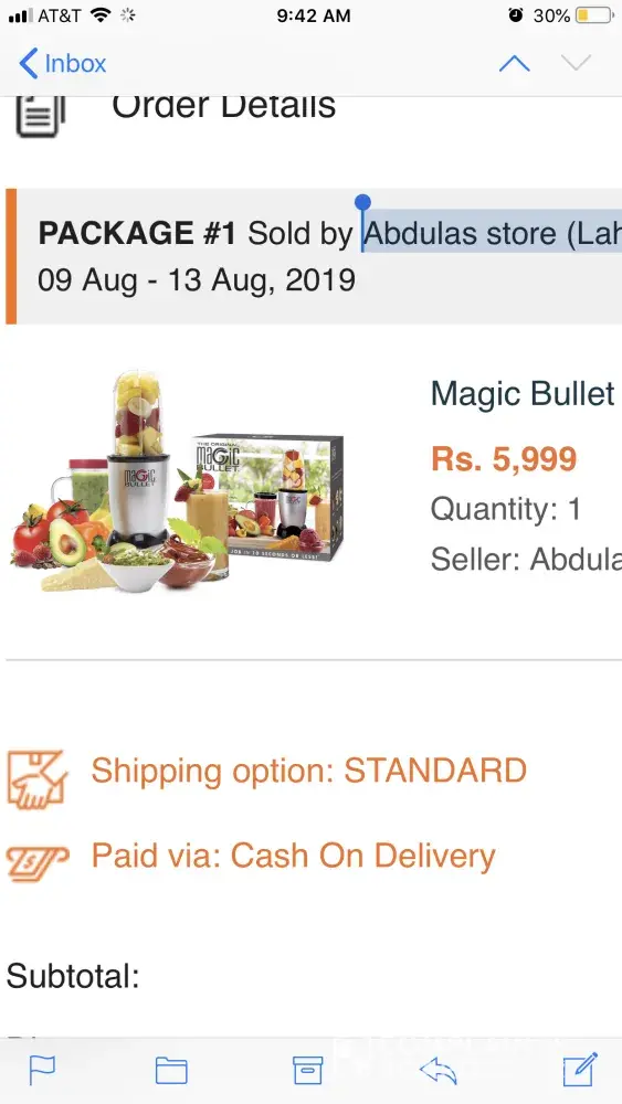 I have placed this order (Order [protected] (blender))with Abdulas store (Lahore) to buy magic bullet blender. They sent me a cheap different product and collected the price on delivery. Now they are not responding to my messages. I'm attaching the picture of the order and the different product they sent me. Please refund my money as this is not the product they advertised on the product page. Thanks arifa +[protected]