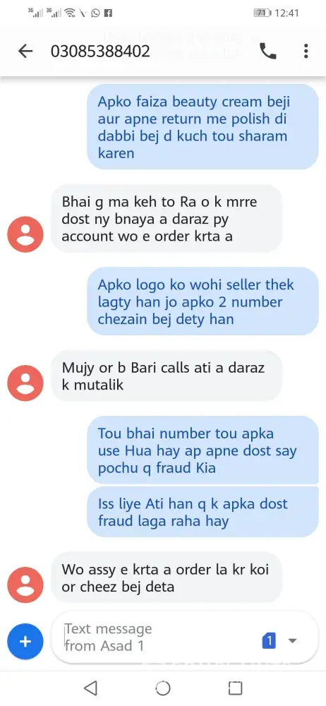 I have been working one year plus on daraz but did not receive any irrelevant return but now I have received irrelevant product. We dispatch faiza beauty cream but received cheery polish box that's also empty then we contact with the customer he says my friend make daraz account with his mobile number and he's friend do with every time he buy something and claimed that there is not anything. I have a proof of massage of customer. Now tell me how daraz catching these types of people shame for daraz.