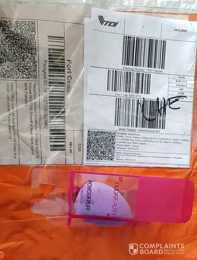 After making a payment of PKR 684 through Cash on Delivery I received the wrong product today on 1st Dec 2018 . A Huda Beauty Powder Puff was delivered to me instead of ordered product . Despite lodging a complaint with the Daraz Helpcare no contact has been made by any such related department & I even tried contacting the Daraz Sender but he never bothered to get back to me or cater my complaint .