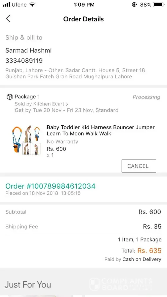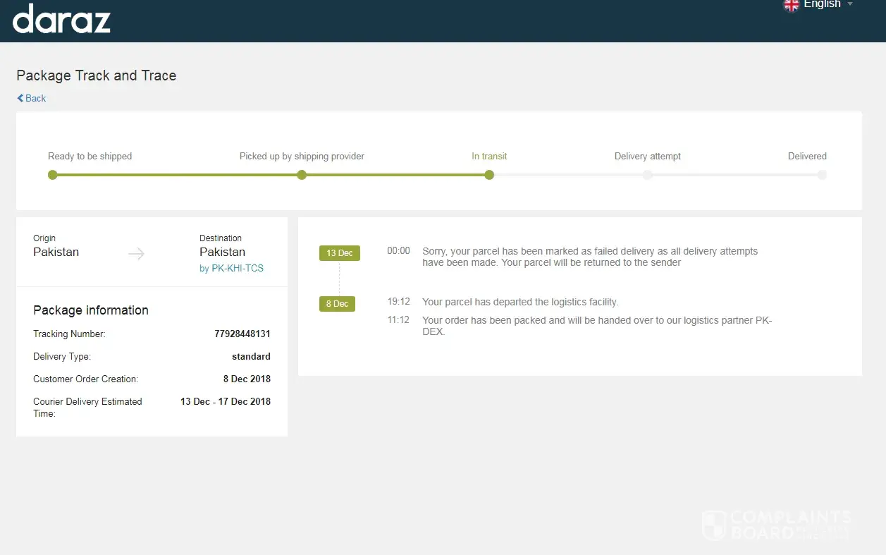 I ordered Kojic Acid face wash from Daraz.pk with order number [protected] and tracking number KI764633912. I have not received it yet since the agreed time on your website was from Nov 24 till Nov 29 and today it's Dec 1. I believe you are in breach of contract.