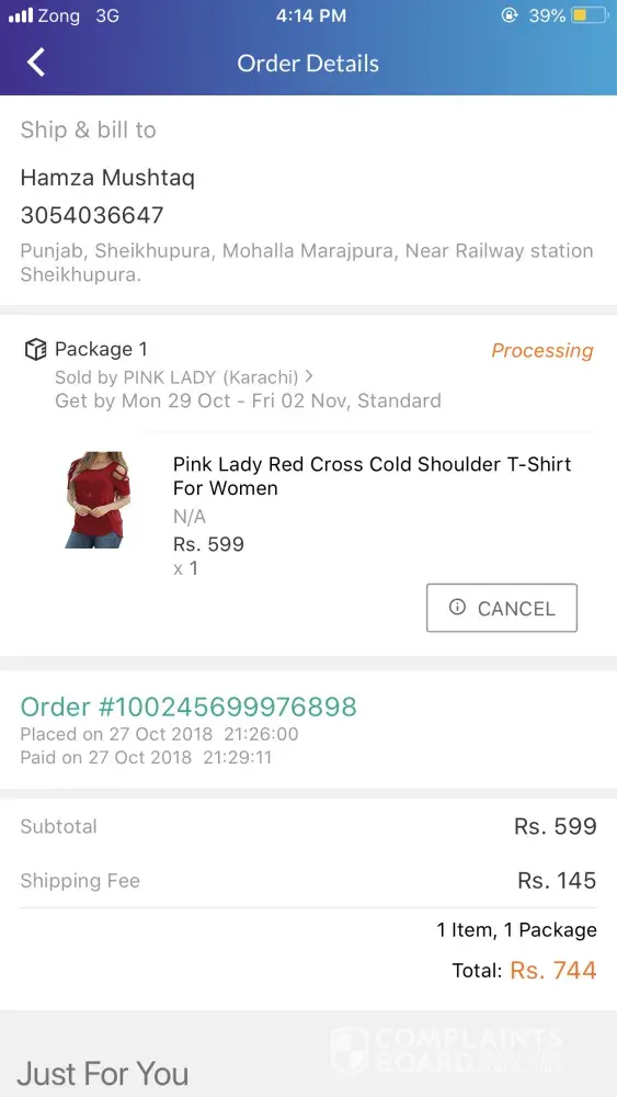 I ordered 6 products through daraz.pk on 11 November 2018 and entered my voucher code to pay for the products. The following day, my products had arrived and I was asked to pay with cash for the products I ordered despite using my voucher. My final payment did not exceed the voucher limit. I did not accept the products and requested them to be returned.