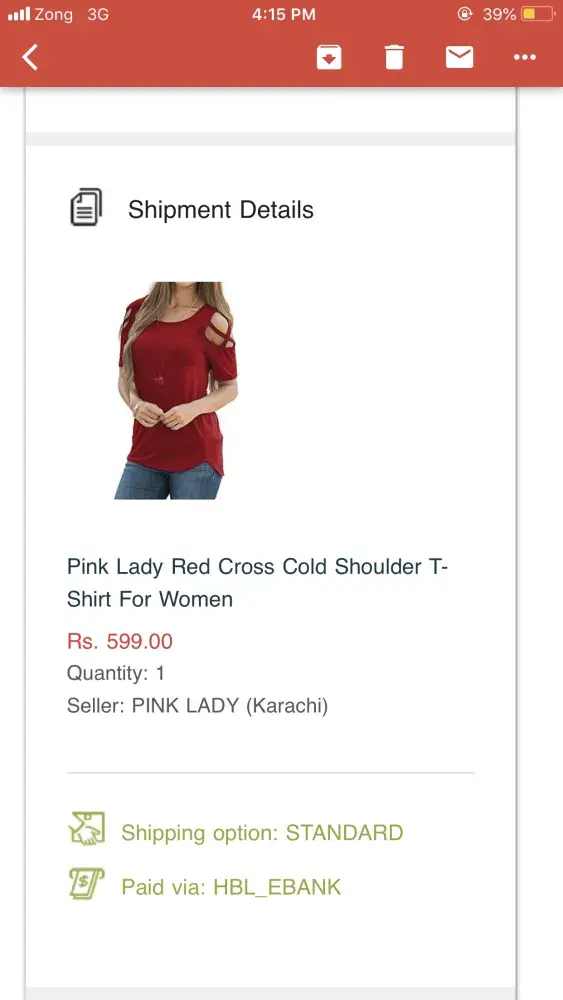 Mujhe aj apne order ka parcel receive hwa. mene pack of three sport shirts order kiya tha. jo k blue, black and red colour ki thi pr jo mujhe aj receive hwa he us me teeno shirts aik hi colour ki (grey) hen. Details neeche de hui hen: