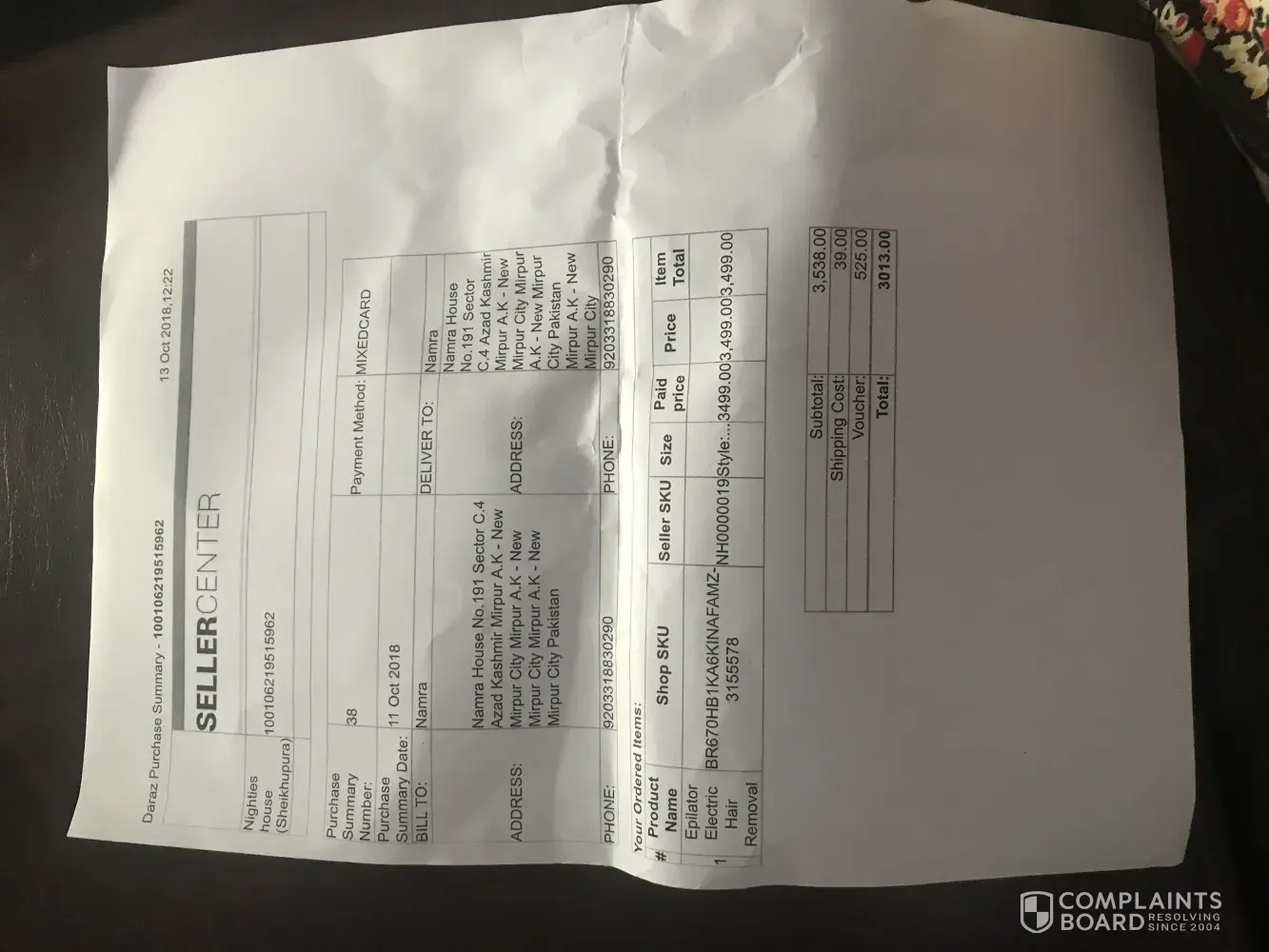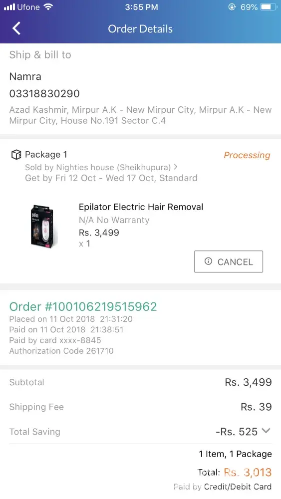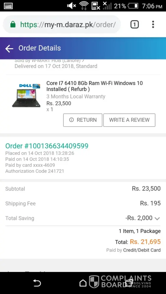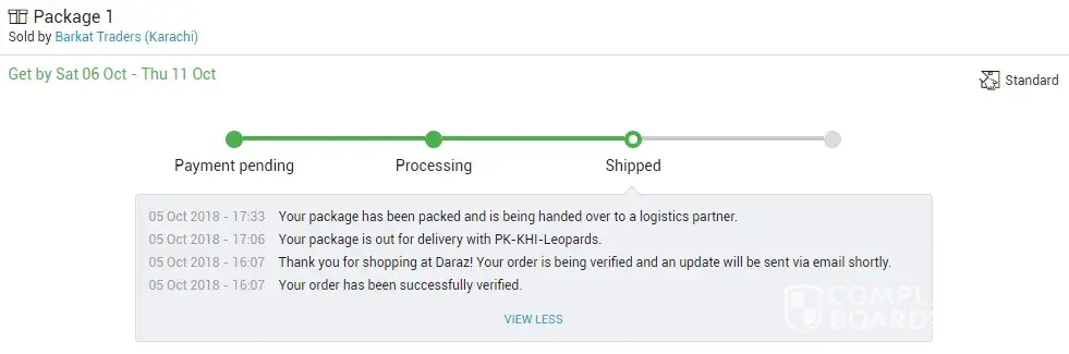 I've ordered a product from Daraz.pk on 5th October 2018, and i have paid through card and the order was processed and confirmed. The timeline was from 6th to 11th October but today is 29 and it's still not received. It's status was changed to Shipped on 13th October and they told me that you will soon received it. But it didn't came. I have complained 6 times but they are not helping me they just said that your complain is updated and we are working on it. Nothing else. The tracking code is still not working on leopard website. I can't cancel it because they told me that you can't because it's already shipped now. So they told me to wait. I am waiting since 11th October. It's been 24 days and they are not helping me out. Please check it out.