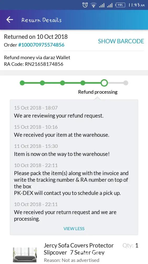 I ordered 7 seater jercy sofa covers on 8 oct, 18 and when I received the item was not as advertised, was defective, used, has foul smell, and was incomplete (one piece was missing) and there was no invoice with it. I filled return form on same day and date and daraz service picked up my pakage on 10 oct n its almost 12 days have passed my money is not refunded n on contacting every time they are saying it wil take 8 days or 6 days just making excuses. Order # [protected].